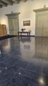 In de trouwzaal ligt een hardsteen vloer , 1 deel was echt al vele jaren oud en in gebruik, het andere deel later bijgelegd na verbouwing .